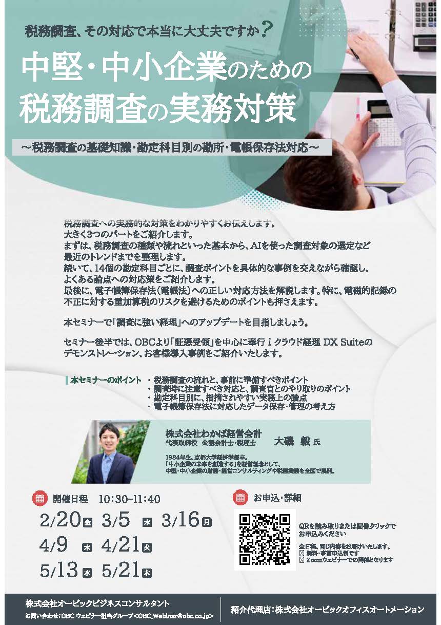 本セミナーでは、経営者様や経理担当者様にそれらの不安を払拭して頂くために、「税務調査とはどのようなものか」「何を事前準備すればよいのか」といった基本的事項、調査当日の対応方法などを、インボイス・電子帳簿保存制度を踏まえつつ、実例を交えながら解説します。
