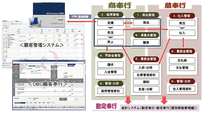 顧客管理(CRM)システム側で作成された顧客・商品・見積もり・受注データを基に、奉行側では売上、請求、入金管理といった業務との連携を低コストで実現できます。