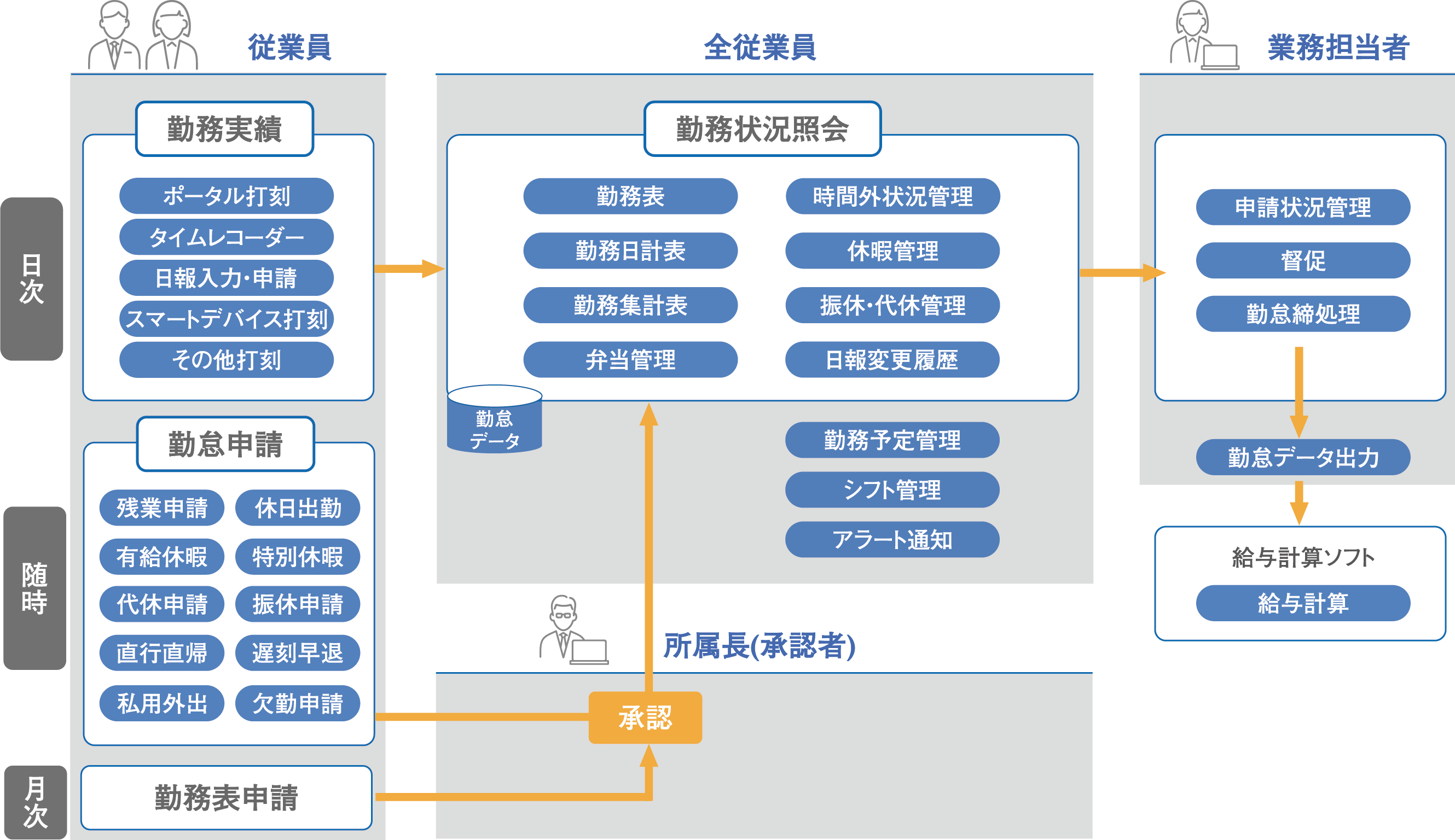 ワークフロー機能としては、残業申請・休日出勤申請・有給休暇申請・特別休暇申請・代休申請・代替休暇申請・振替休暇申請・欠勤申請・遅刻早退申請・交通機関遅延申請・直行直帰申請・私用外出申請・勤務表申請ができます。