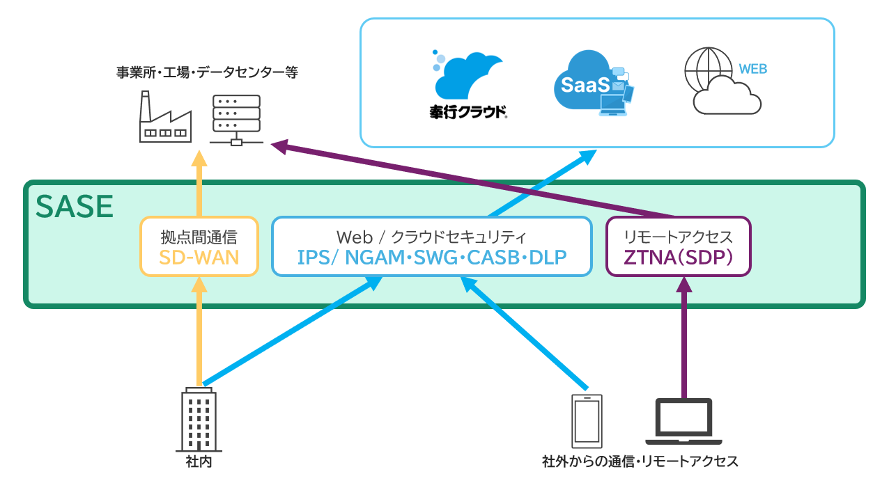 一方SASEでは、ユーザー・端末・アクセス先・状況を都度評価し、必要最小限のアクセスのみを許可するというゼロトラストの考え方が採用されています。