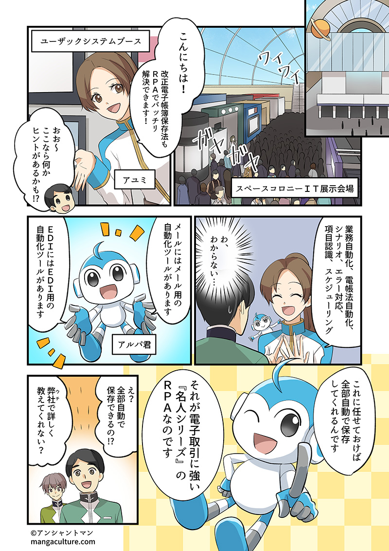 オービックオフィスオートメーションは電子帳簿保存法への対応のソリューションとしてRPAの活用もご提案させていただいております。 特にユーザックシステムの『名人シリーズ』は奉行シリーズとの親和性も高く、おすすめです。 ここでは『名人シリーズ』による『電子帳簿保存法』への対応をマンガでご紹介します。